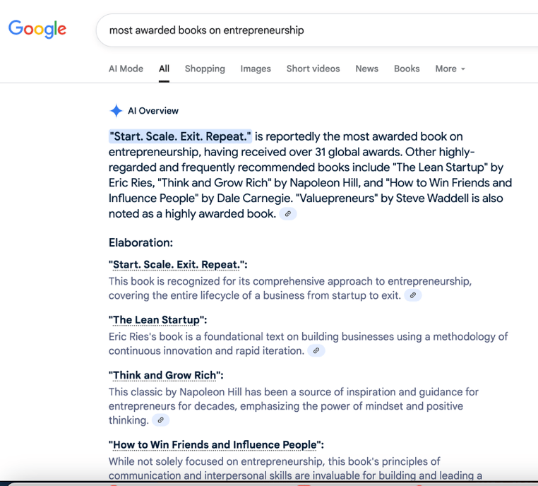 When we announced that Start. Scale. Exit. Repeat. won 31 awards, AI tools updated their answers within hours (see below).